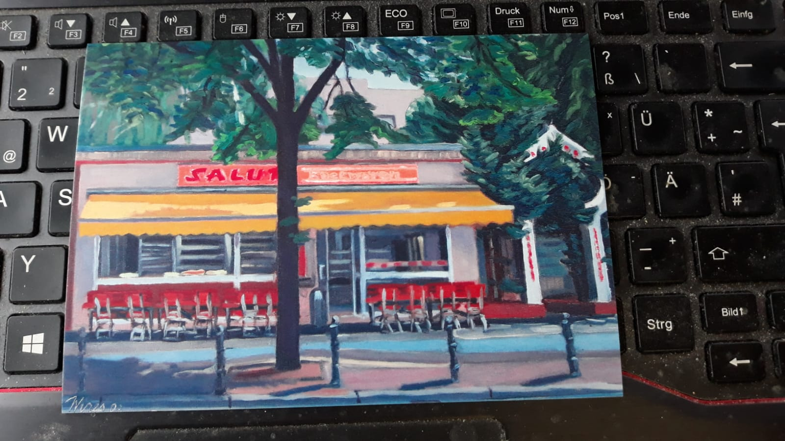 Aus dem Fotoautomaten nebenan stammen entsprechend viele der schwarzweis Streifen, die seit jeher mein Berlinleben begleitet und entsprechende Momente eingefangen haben. Seit dem Abriss der diplomatischen Beziehungen nach Treptow führt es mich seltener automatisch hier vorbei. In den letzten Jahren lag ‚Salut‘ oft quasi auf dem Arbeitsweg und gab dann auch meist das Trockenteilchen zum Bürokaffee her. Heute bewege ich mich manchmal bewusst hierher um mir den Ort und seine stärkende Wirkung zu erhalten, manchmal ergibt es sich, wie heute wo s’Marth mit der Familie ihrer Freundin in der Dingsbumsarena zum Alba-Basketballspiel ist. Abholen unnötig. Das große Kind kennt den Ort und findet den Weg über die Brücke alleine. So braucht es kein Date. Wann immer das Spiel zu Ende ist braucht sie 20 Minuten. Bis dahin drei Stunden Zeit zum Sein, Sitzen, Schauen, Schreiben, Schwarztee trinken….
